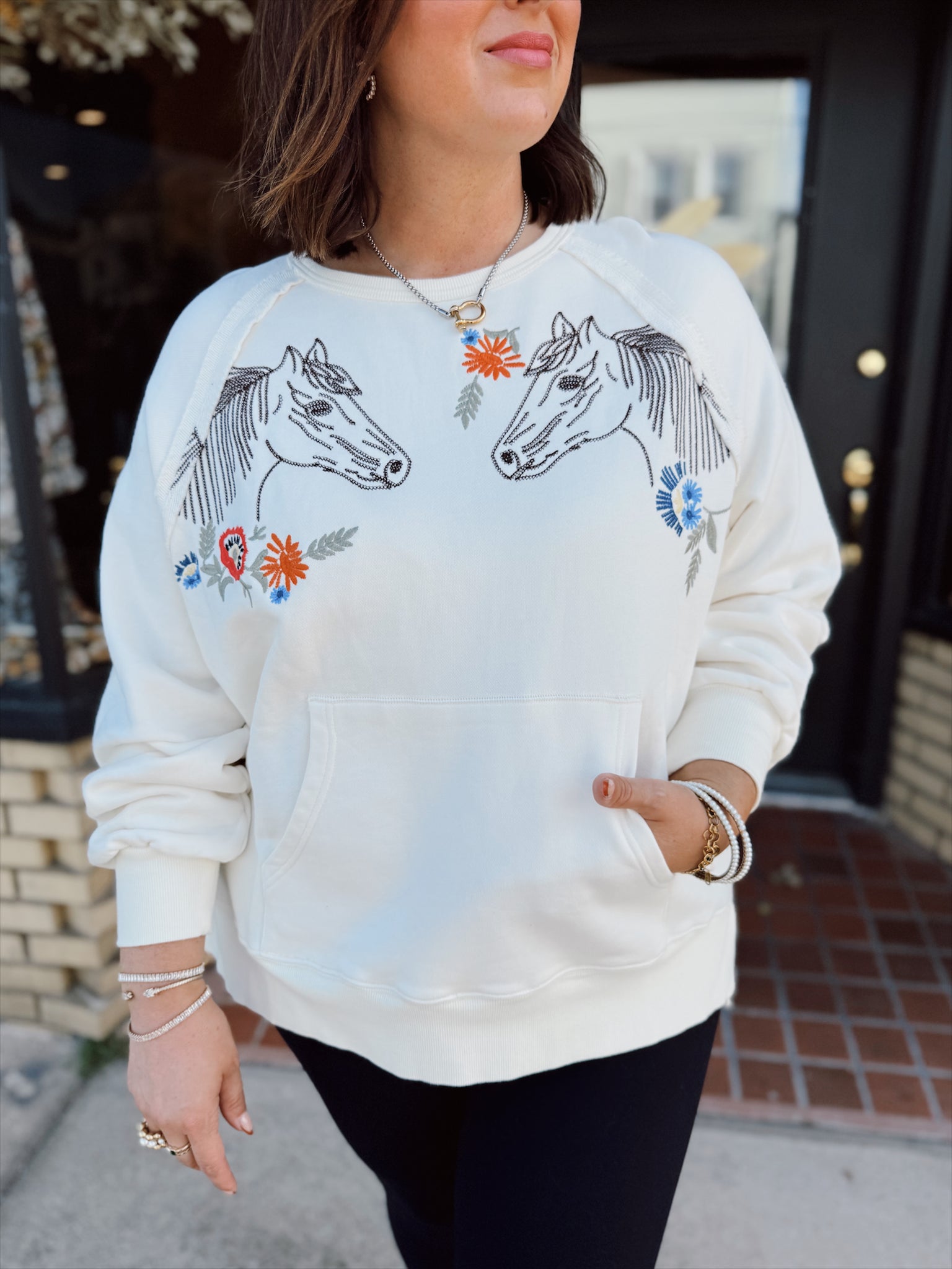 Effortlessly cozy with a touch of western charm, this cream-colored sweatshirt is a must-have for casual days. Featuring hand-drawn style horse graphics accented with vibrant floral details, it brings a playful yet stylish twist to your everyday look. Designed with a classic crew neckline, relaxed fit, and roomy front pocket, this sweatshirt pairs perfectly with leggings, jeans, or your favorite boots. Soft, comfortable, and eye-catching—this piece is made for horse lovers and free spirits alike.