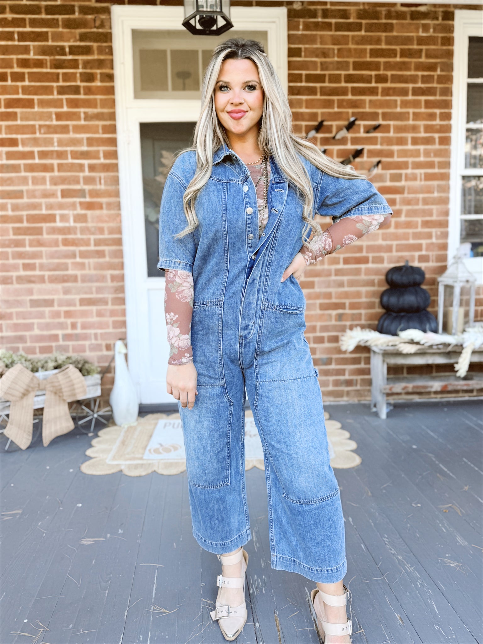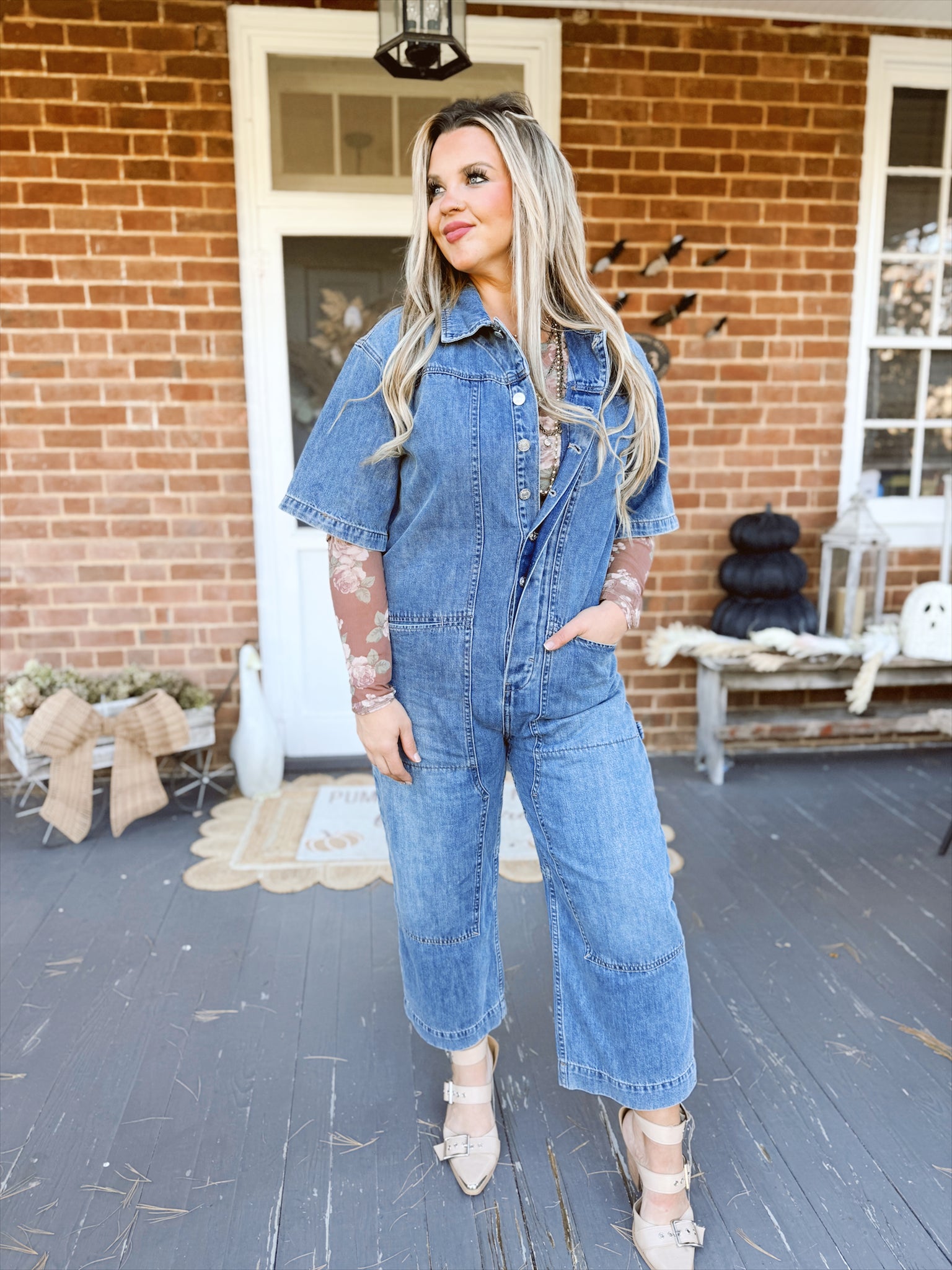 Mineral washed short sleeve denim jumpsuit. Utility style with an edgy oversized + straight fit. Featured pockets and a button front style.