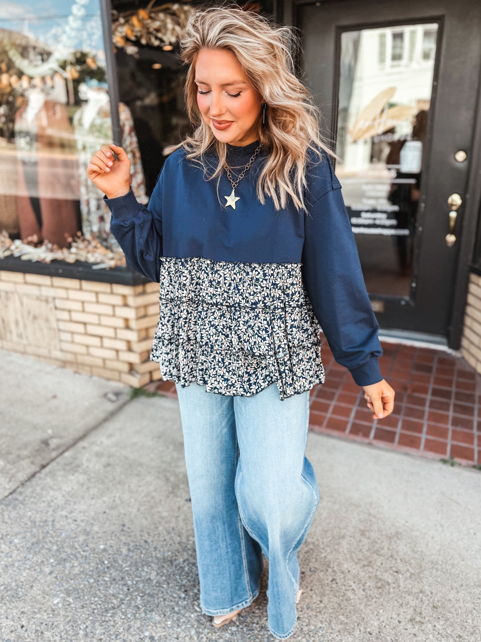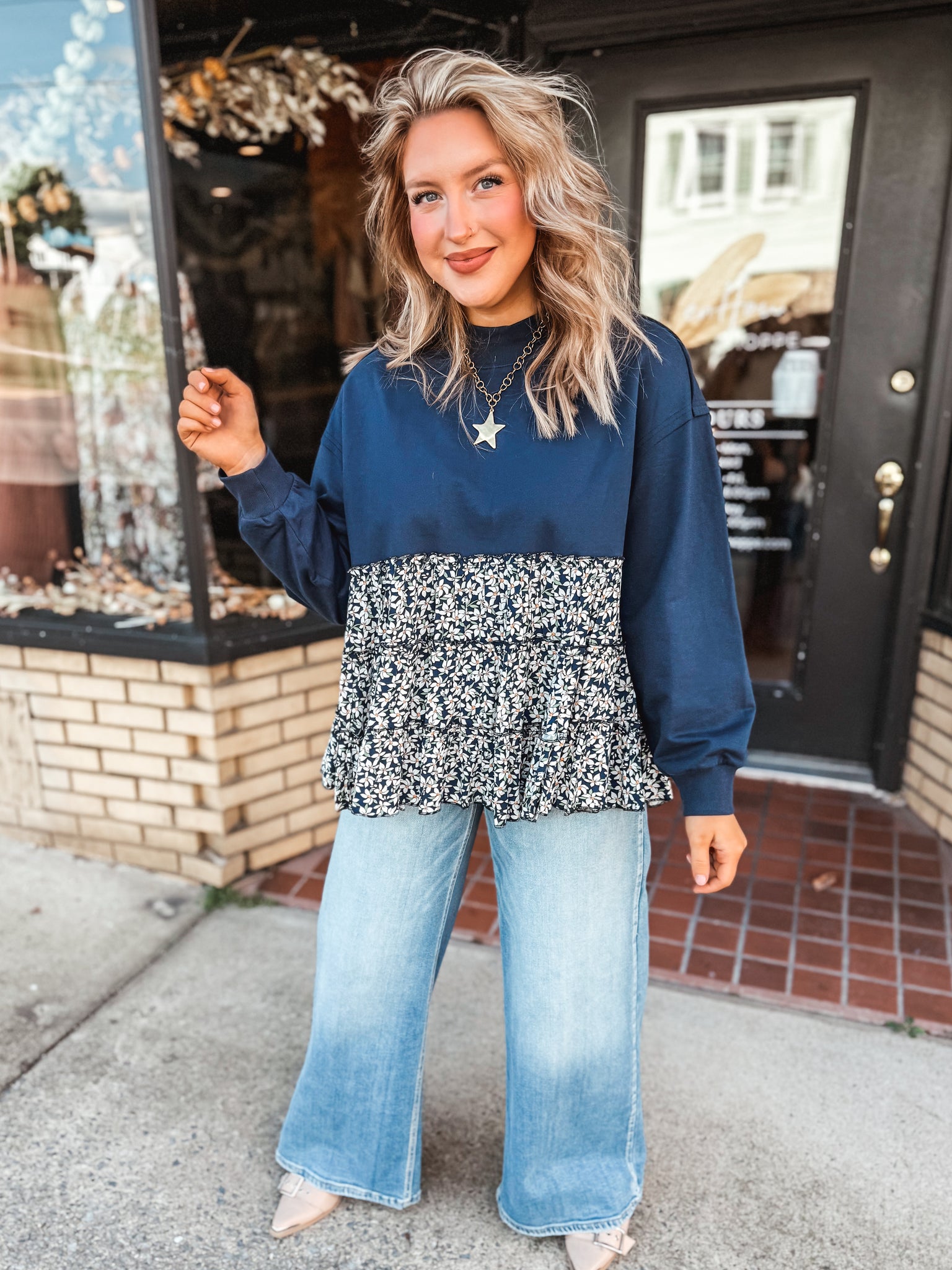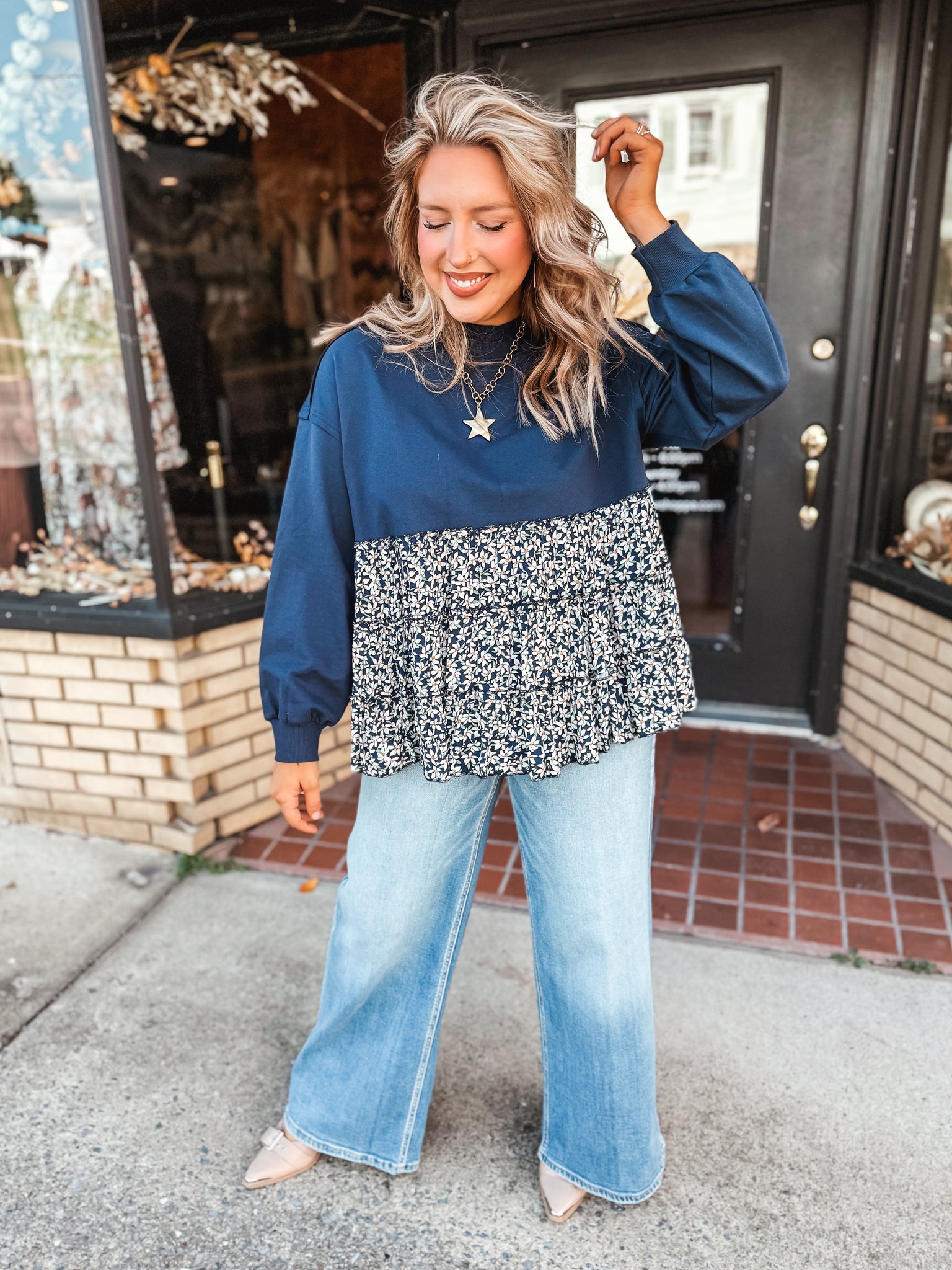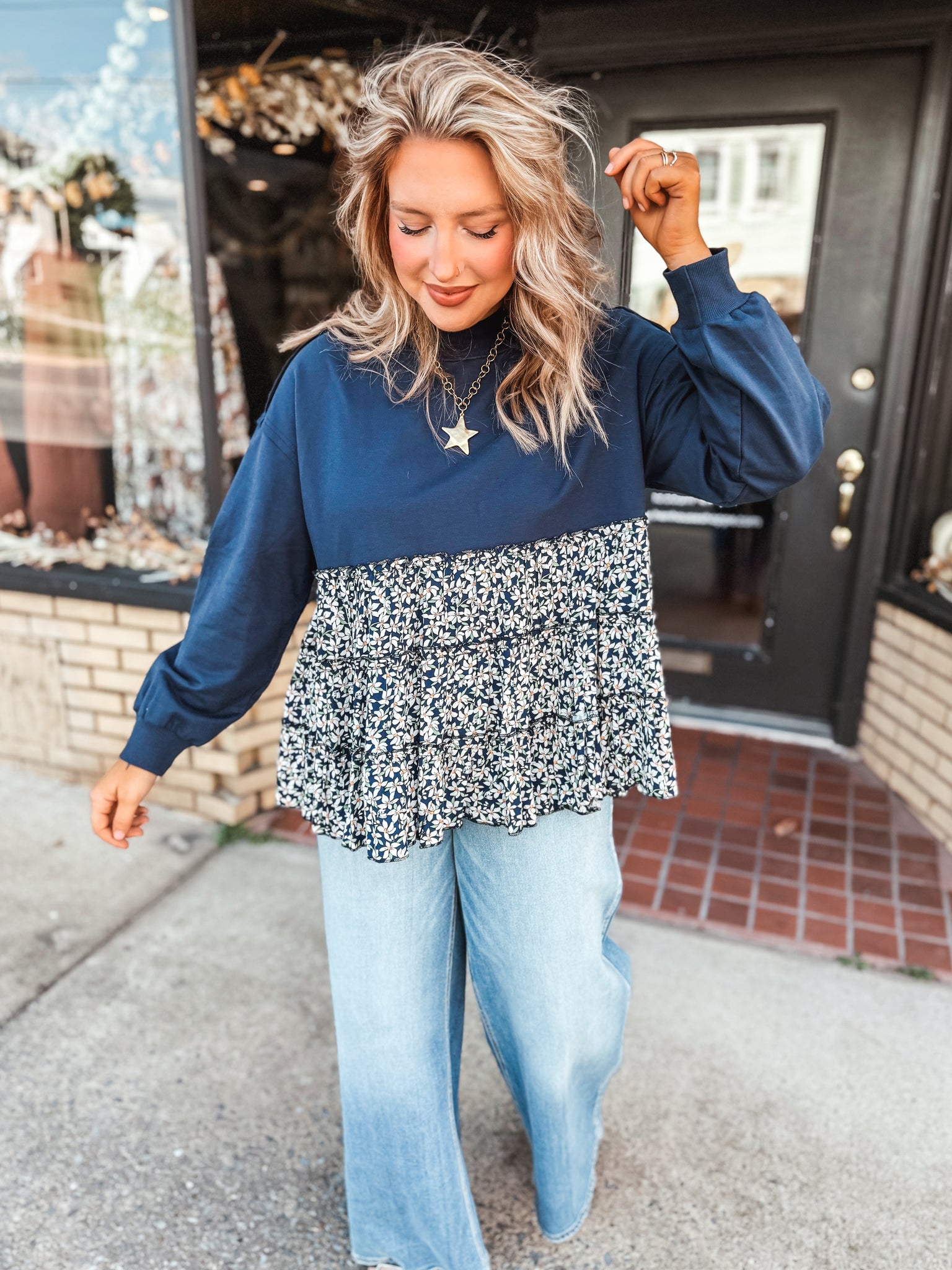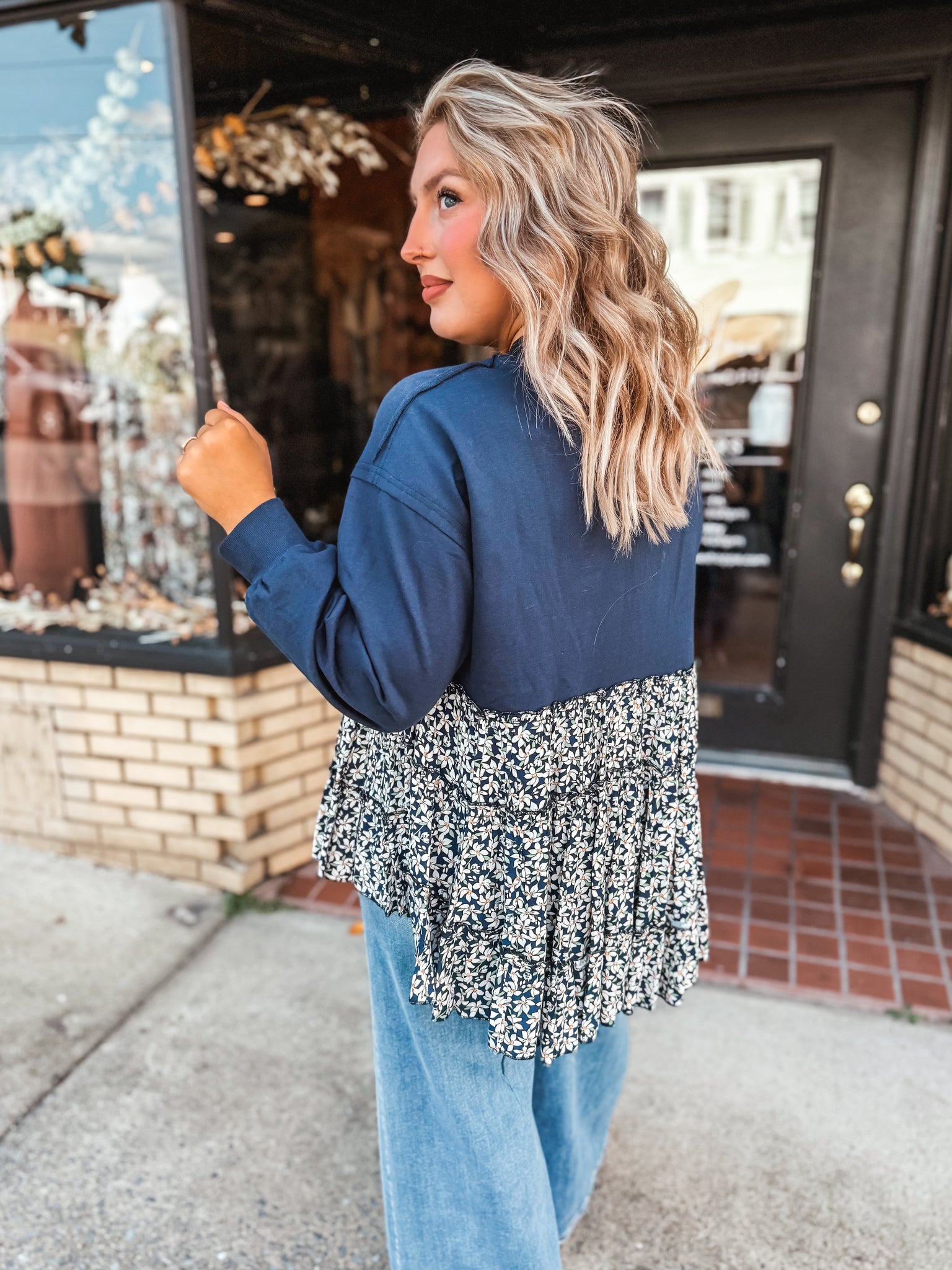 Crewneck sweatshirt top with a tiered babydoll floral print bottom.
