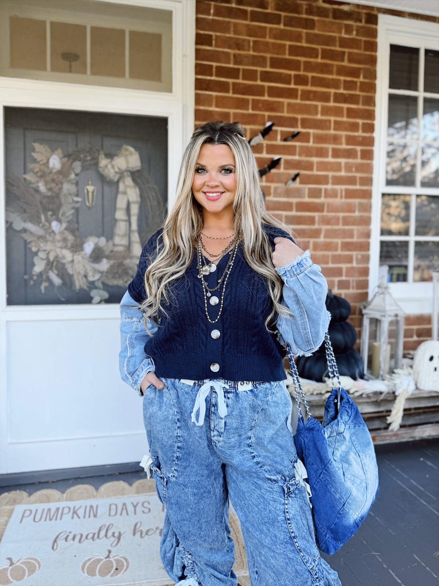 Frayed denim sleeve cable knit cardigan with front buttons.