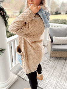 Checkered denim mixed with sweater knit material for a trendy and unique zip up cardigan featuring a hood.
