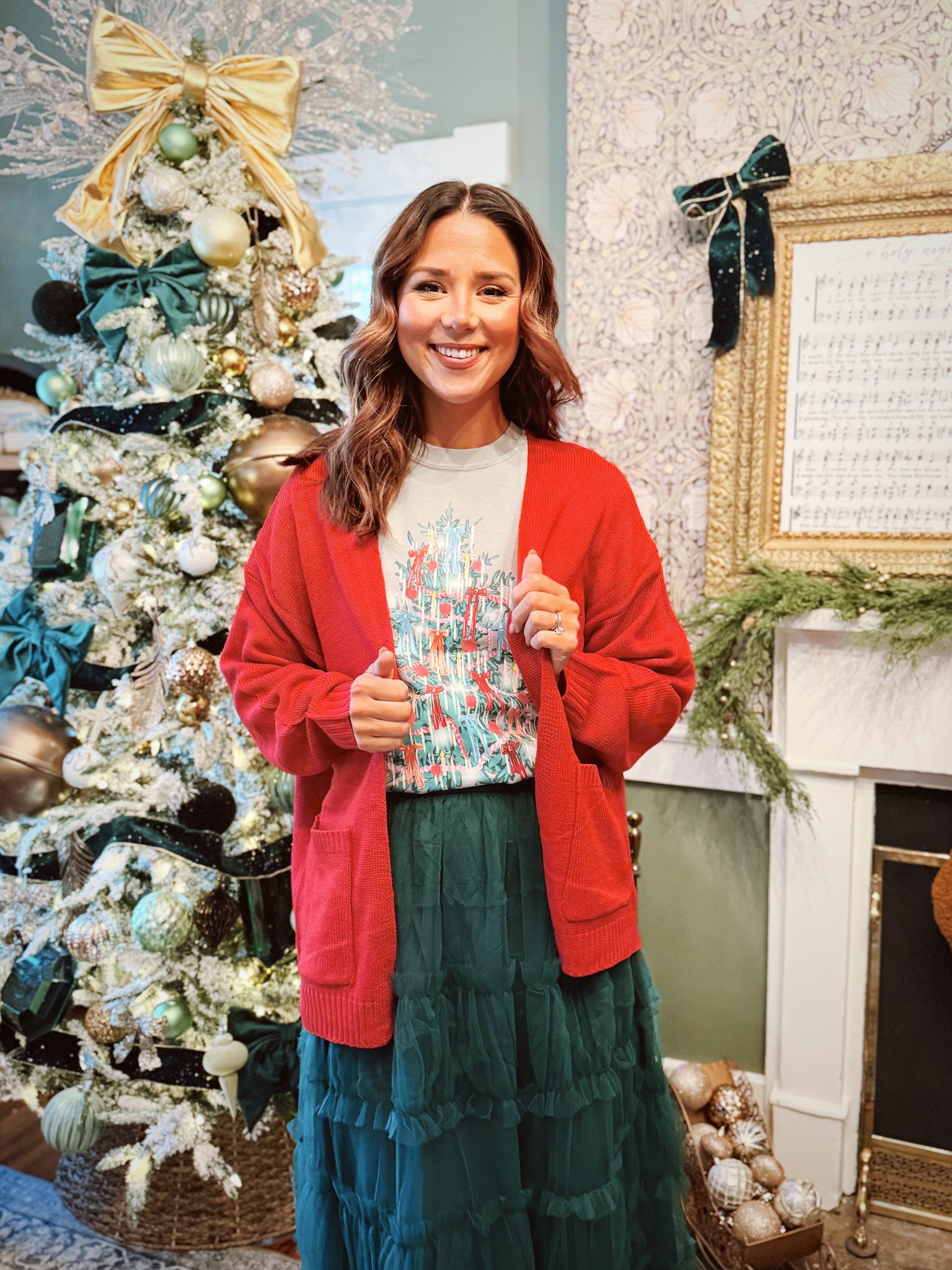 Open front knit cardigan with front pockets and long sleeves. Lightweight knit - perfect for an easy layer! Red