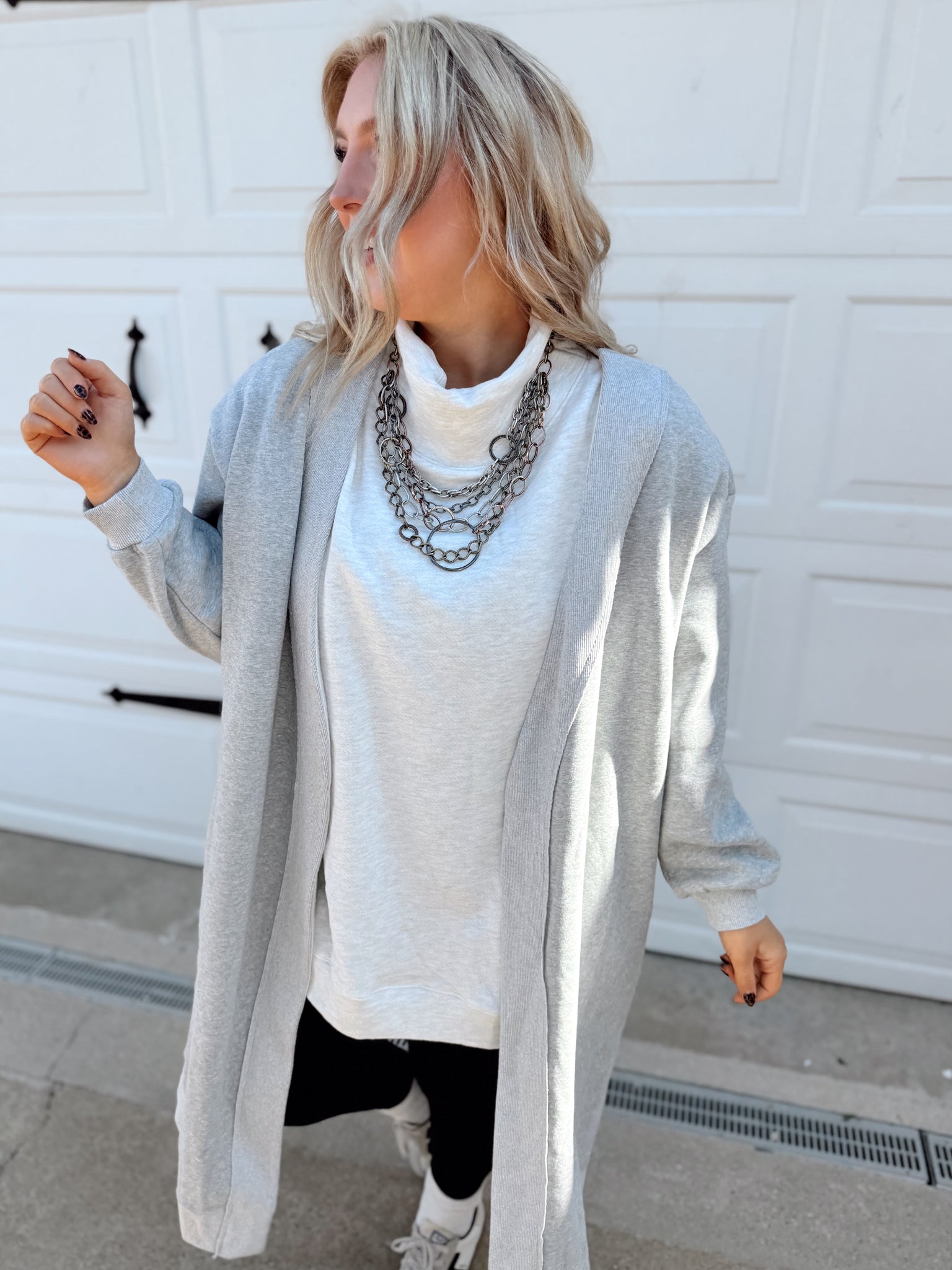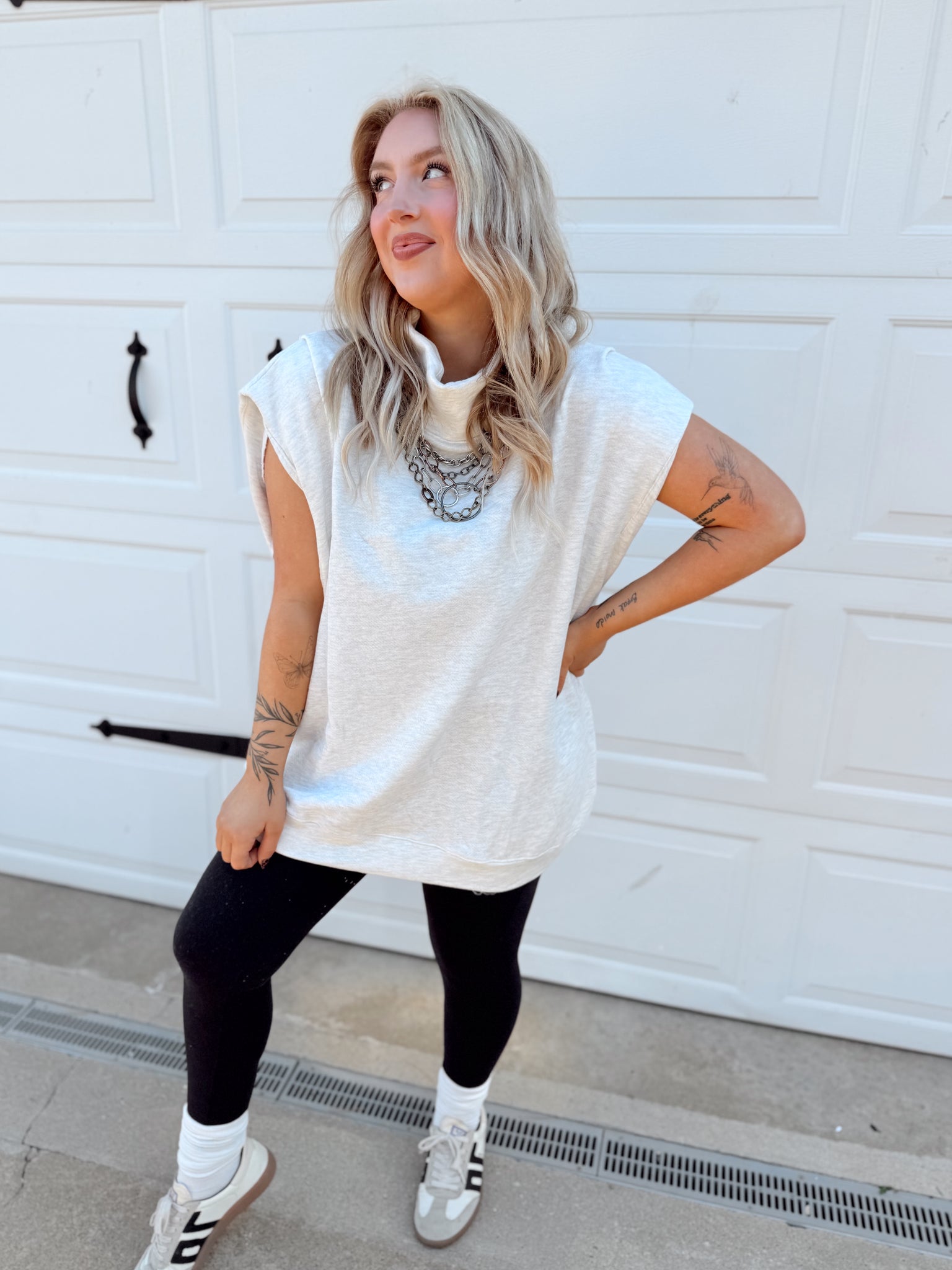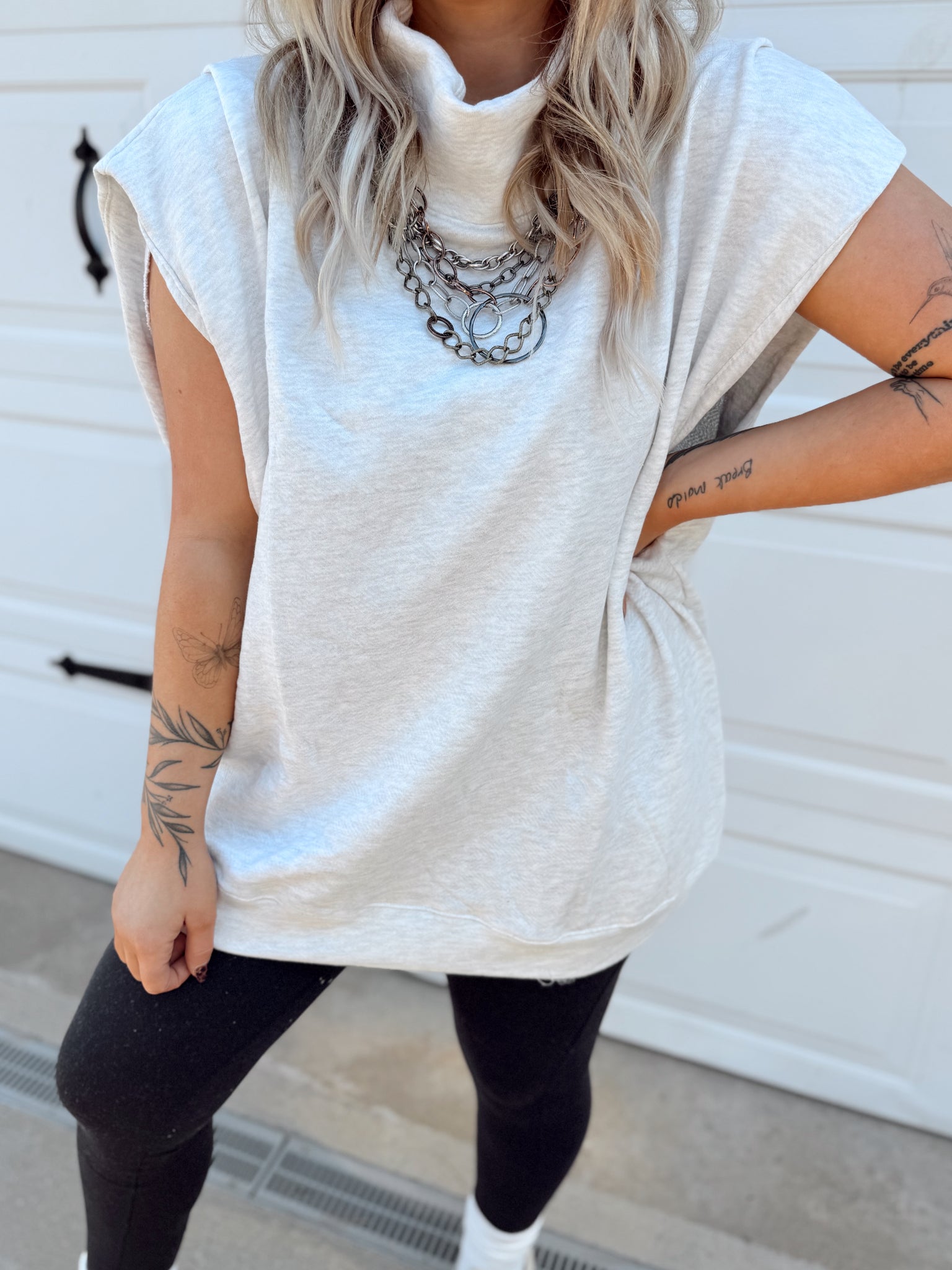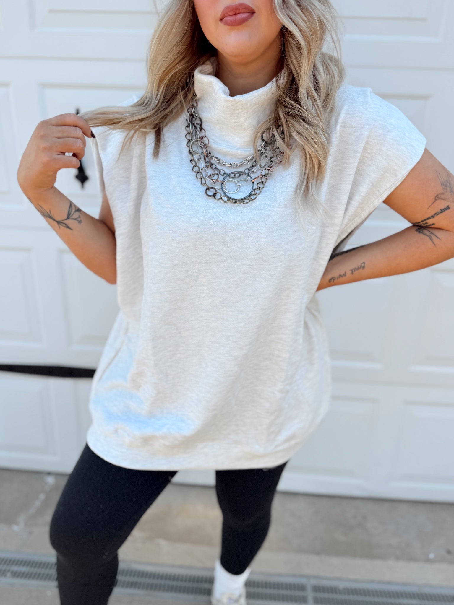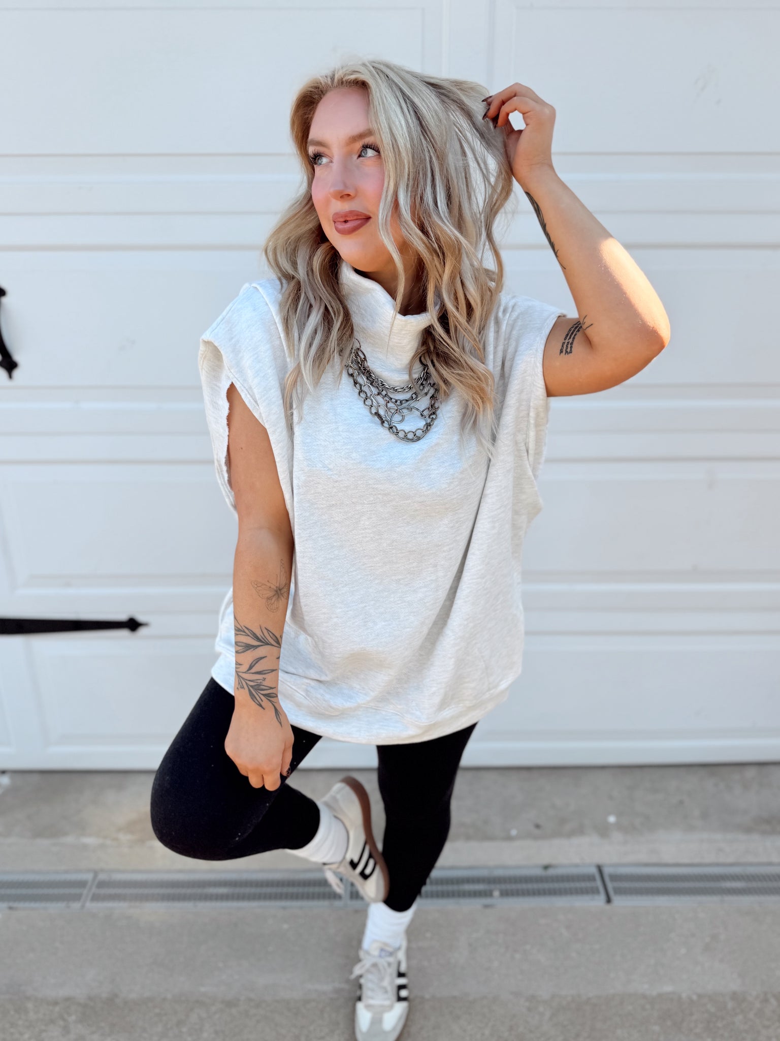 Solid mock neck oversized muscle top with a wide cap sleeve sleep and side pockets.
