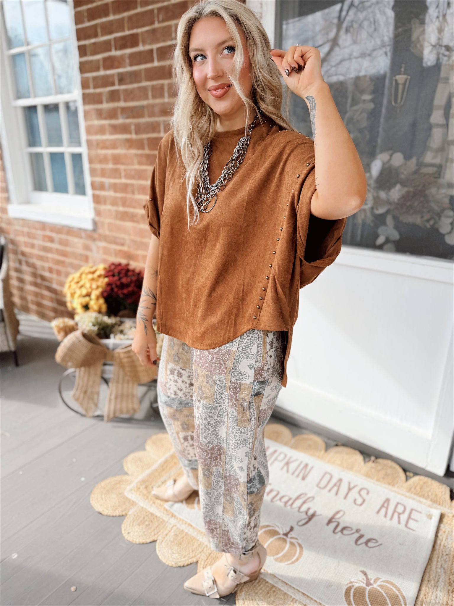 Hi-low hem short sleeve suede shirt with brass studded shoulders and side hemlines. Features a side slit and scoop hemline. Perfect with denim or leggings!