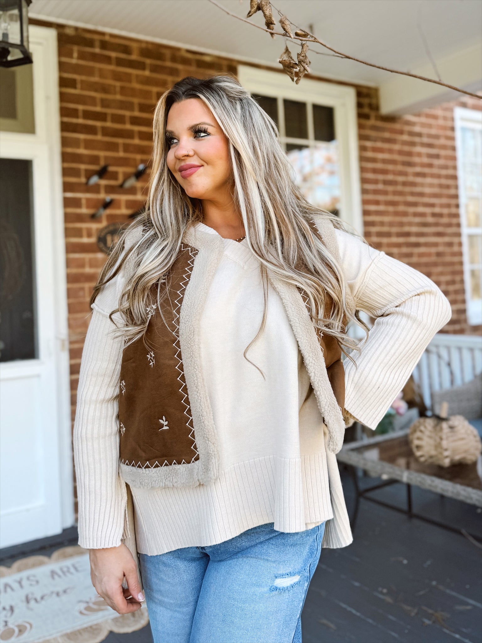 Sherpa fleece lined vest with a boho + western embroidered style.
