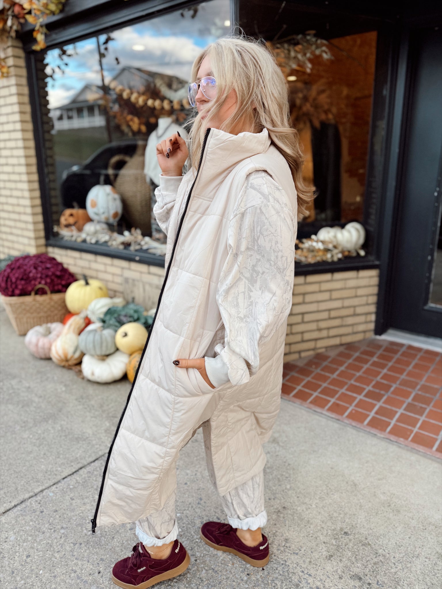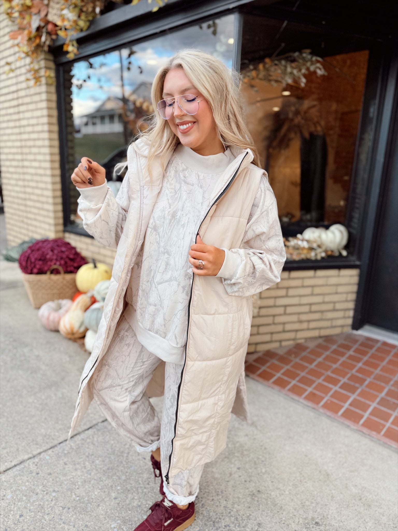 Midi length puffer vest featuring a collar, side pockets, side slits, and a front zipper. Perfect for those chilly days when you need an extra + cute layer! Also available in black.