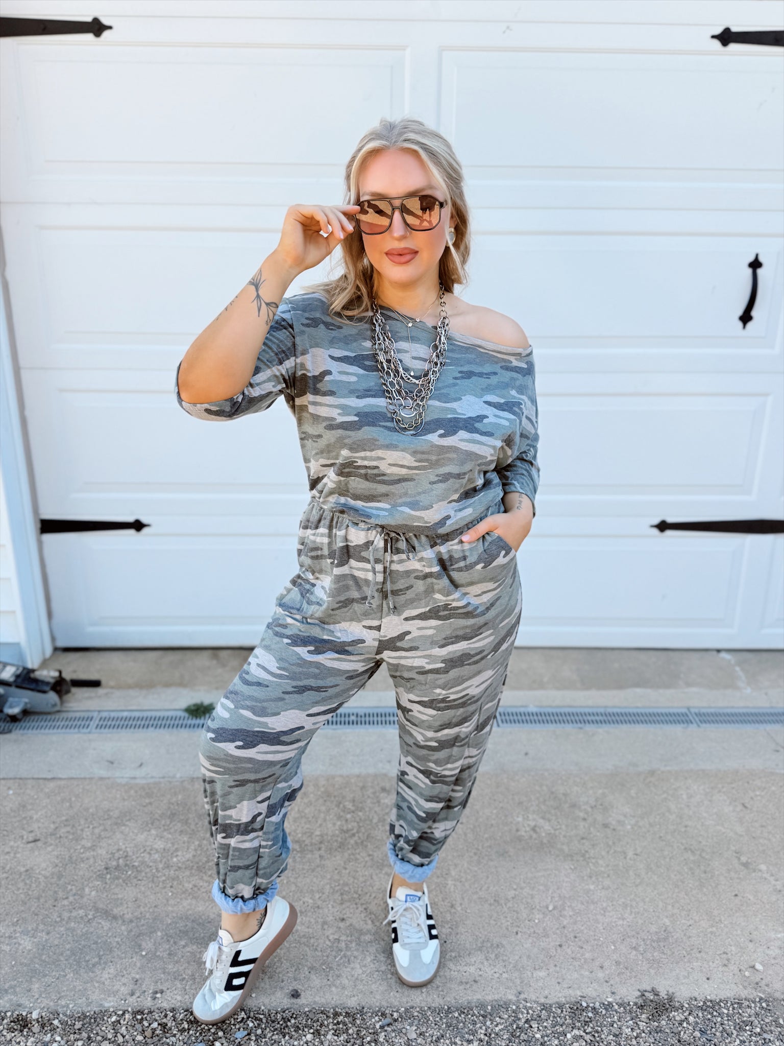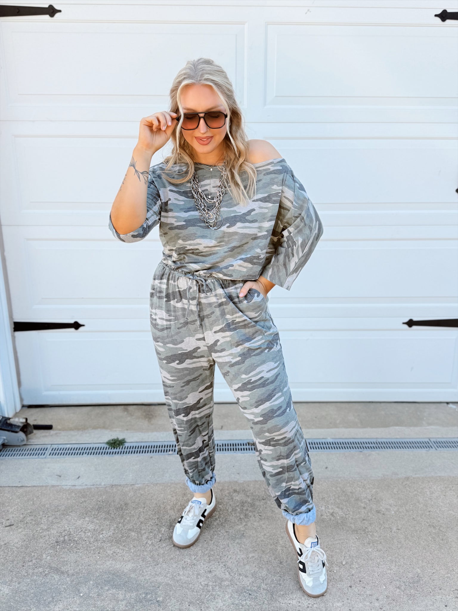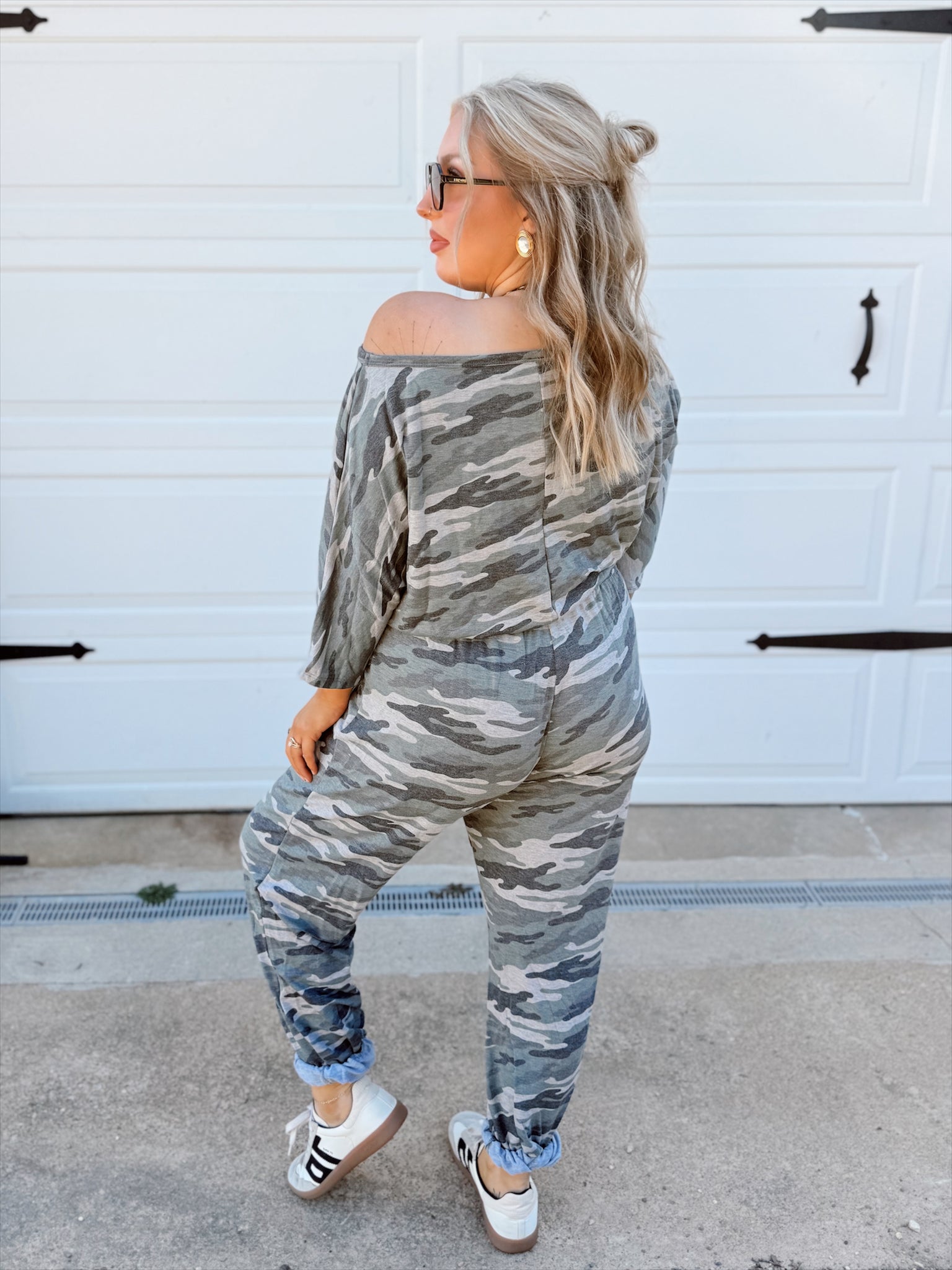 Army green camo print jumpsuit with a boatneck, short dolman sleeves, and elastic joint waist with spaghetti tie detail.
