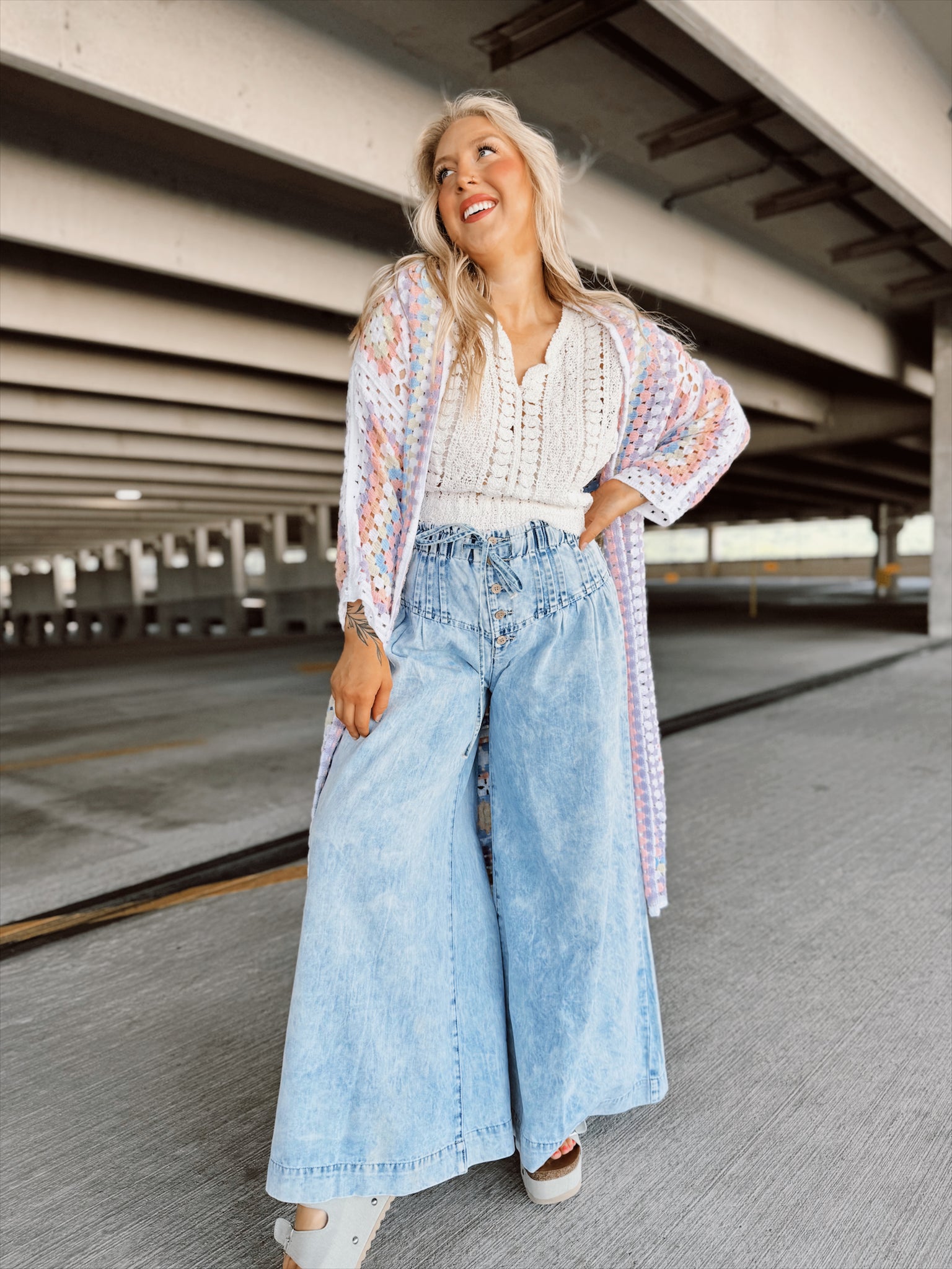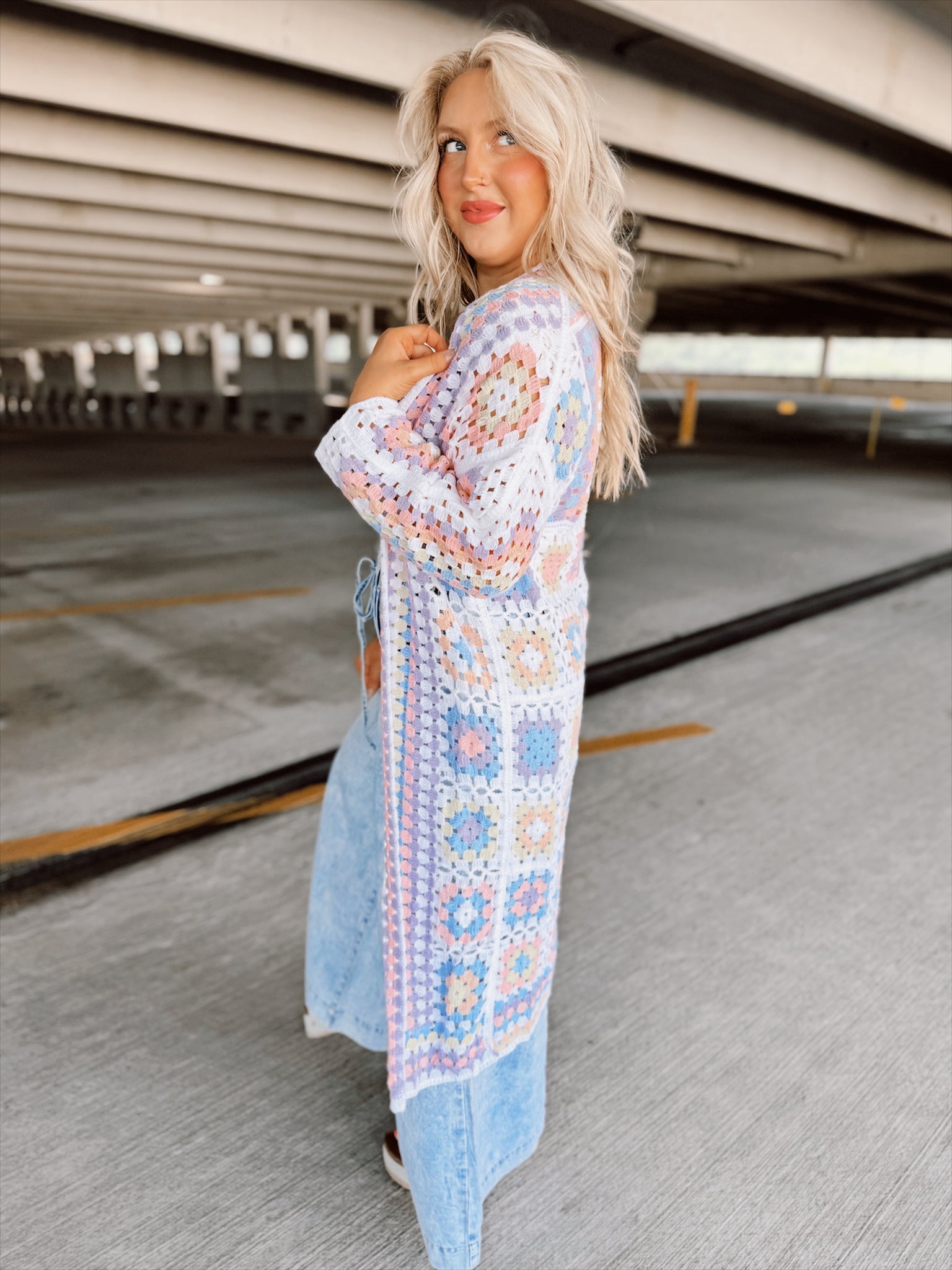Long sleeve crochet cardigan with a colorful granny square design and midi length. One size fits most.