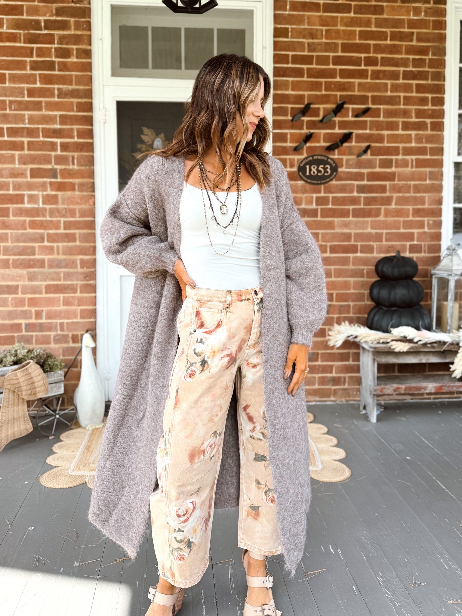 Oversized open front cardigan sweater with a chunky knit and rolling edge detail. Runs very roomy.