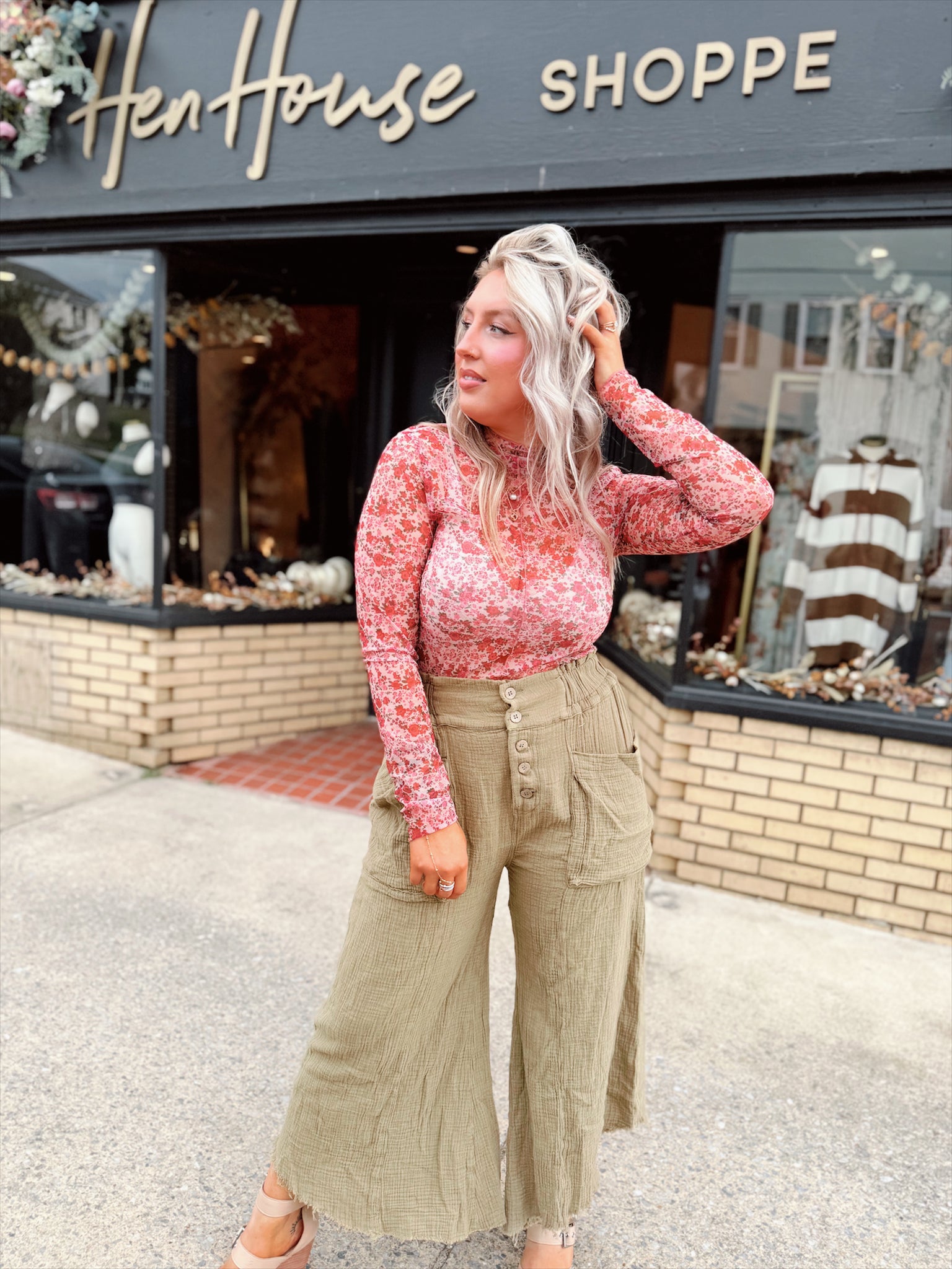 Floral printed lettuce edge mesh mock neck top with dainty micro florals for a vintage patterned feel. Lightweight and see through, ideal for layering!