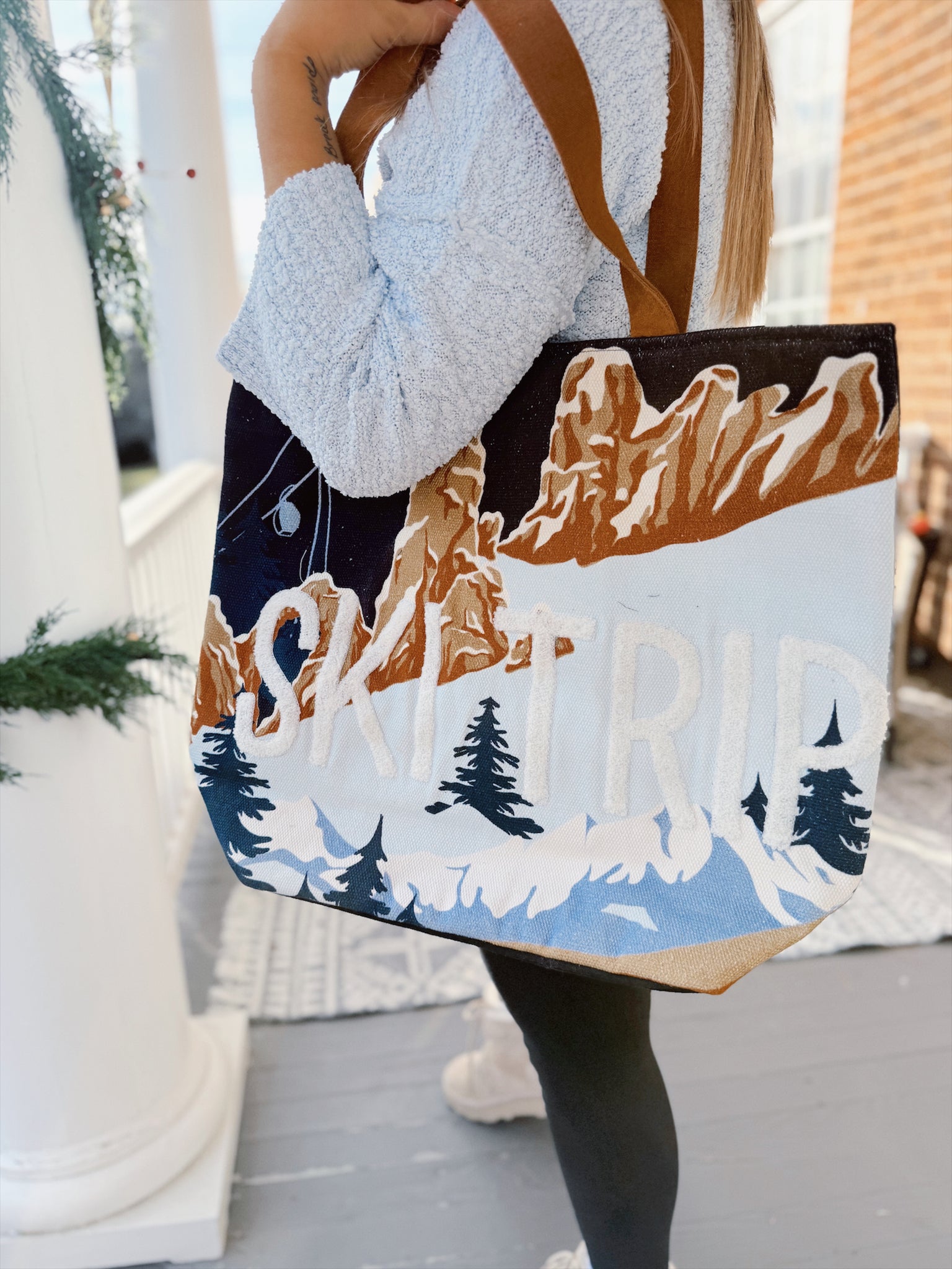 Beautiful embroidered extra large tote bag with a mountain + ski + snow scene. Super spacious.