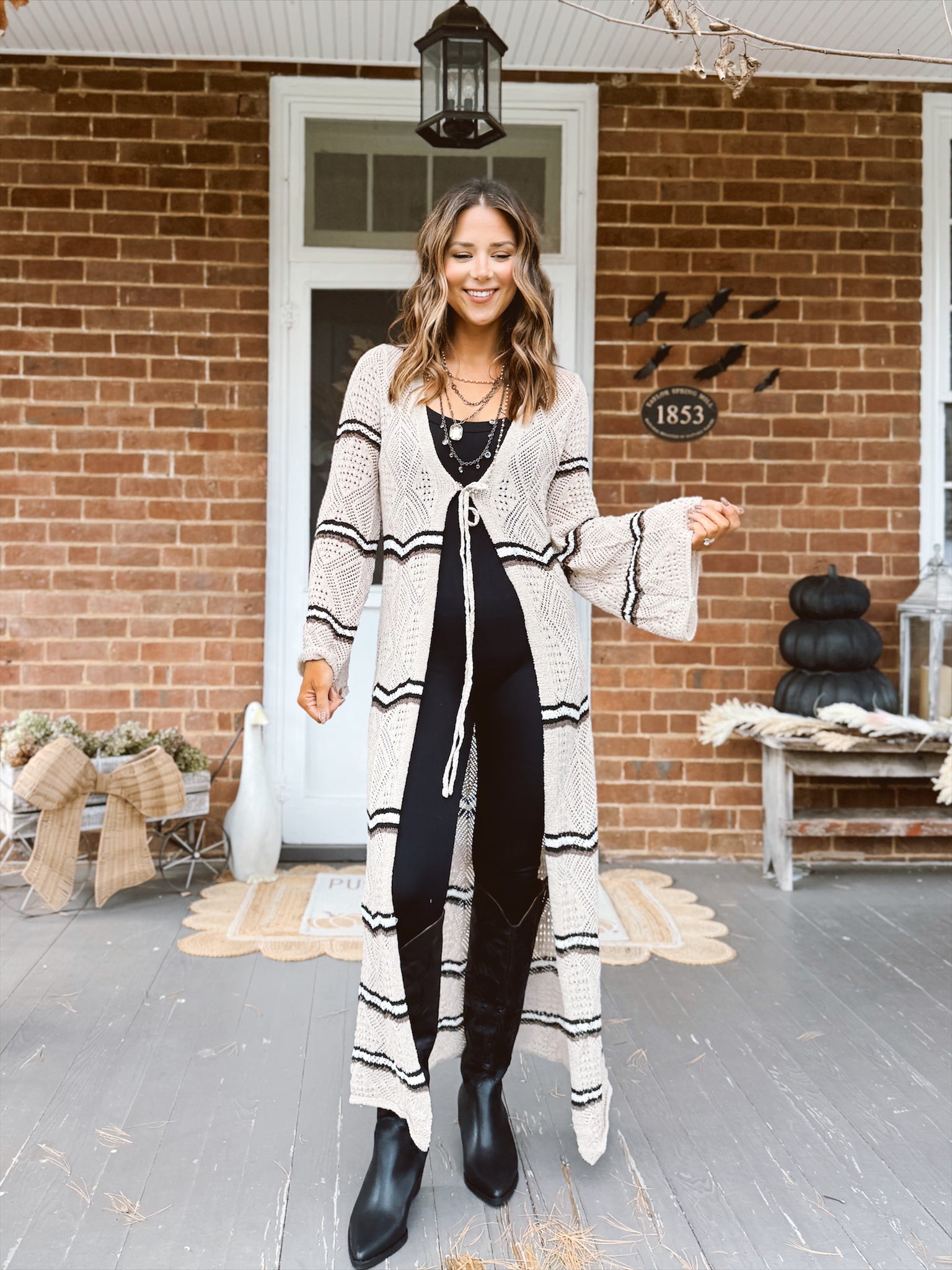 Maxi length open front cardigan with a front tie and bell sleeve style. Open knit crochet cardigan.