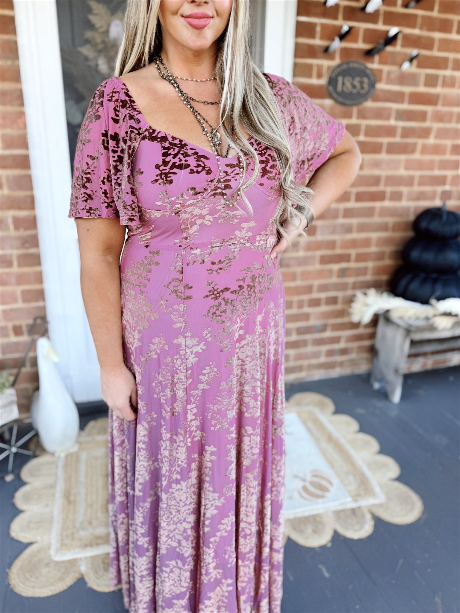 Burnout velvet detail maxi dress with a sweetheart neckline, flutter sleeves, side pockets, and a partially smocked back bodice. Features a full lining and hidden side zipper.