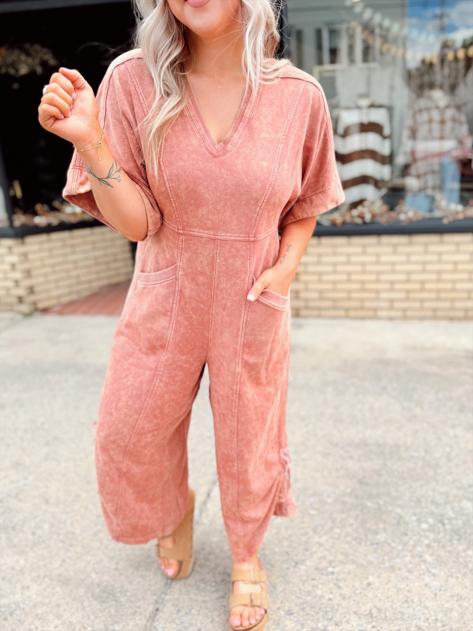 Oversized short sleeve + pants jumper with a zipped back and v-neckline. This is totally a FP style and we’re loving the comfort + cute combination. Also features a ruched gathered side for adjustable pants length!