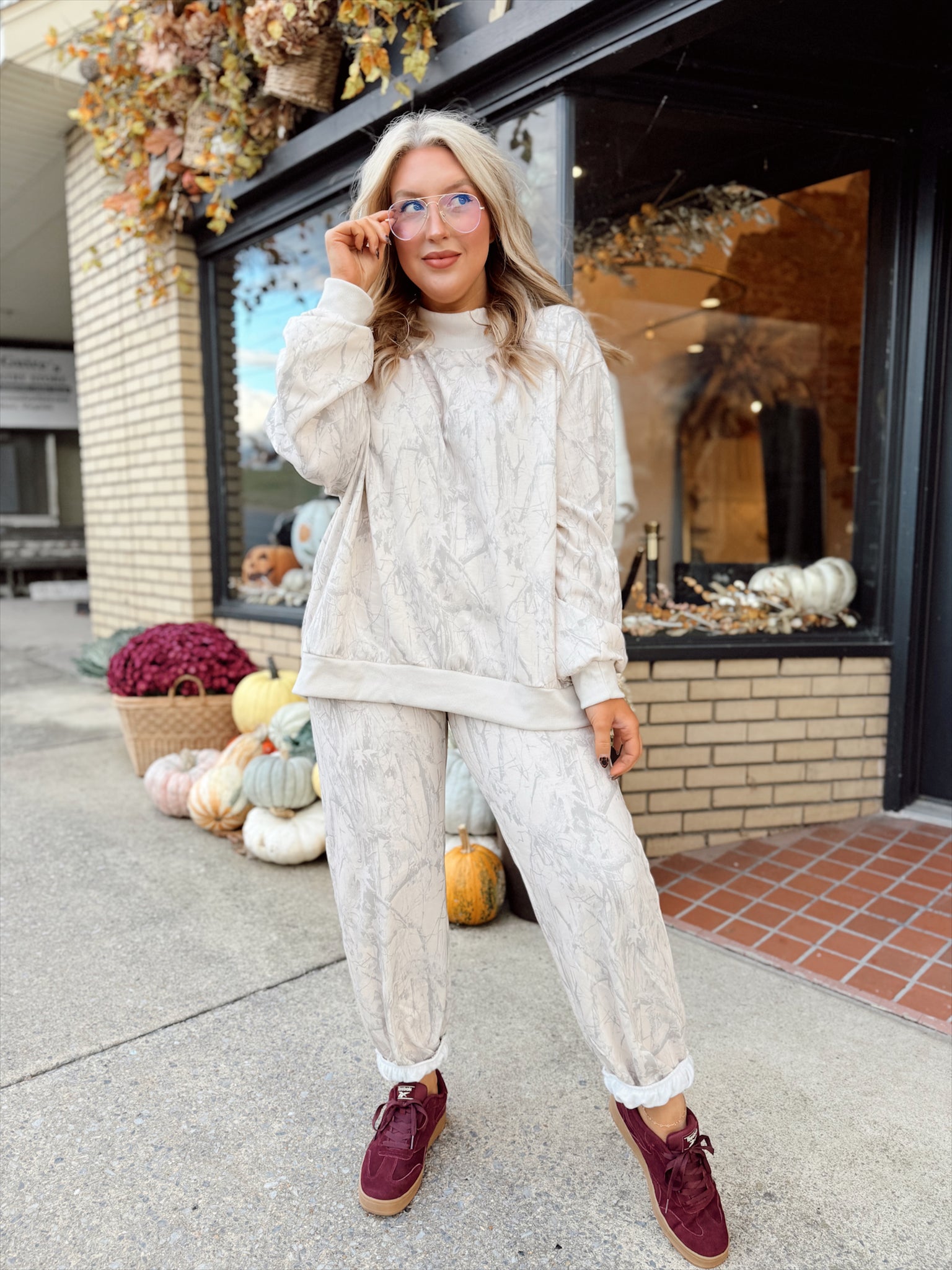 Oversized mock neck lightest camo pullover with long sleeves and a cuffed wrist. Pairs perfectly with the Undercover Camo Joggers!
