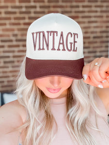 Great quality trucker hat with an embroidered “VINTAGE” graphic and snap back detailing.