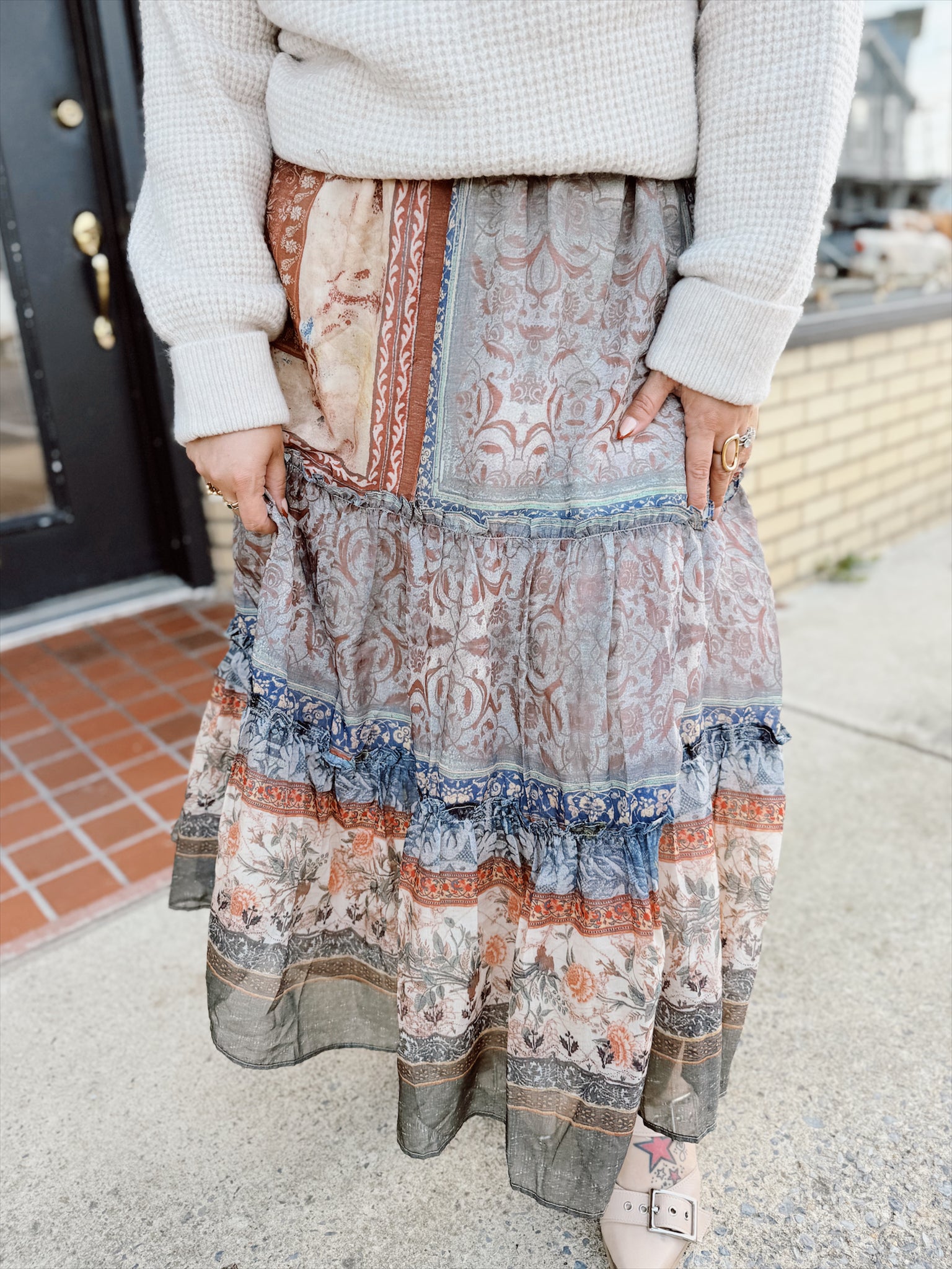 Fully lined maxi skirt with an elastic waistband and patchwork maximalist style. Rust/Blue/Olive