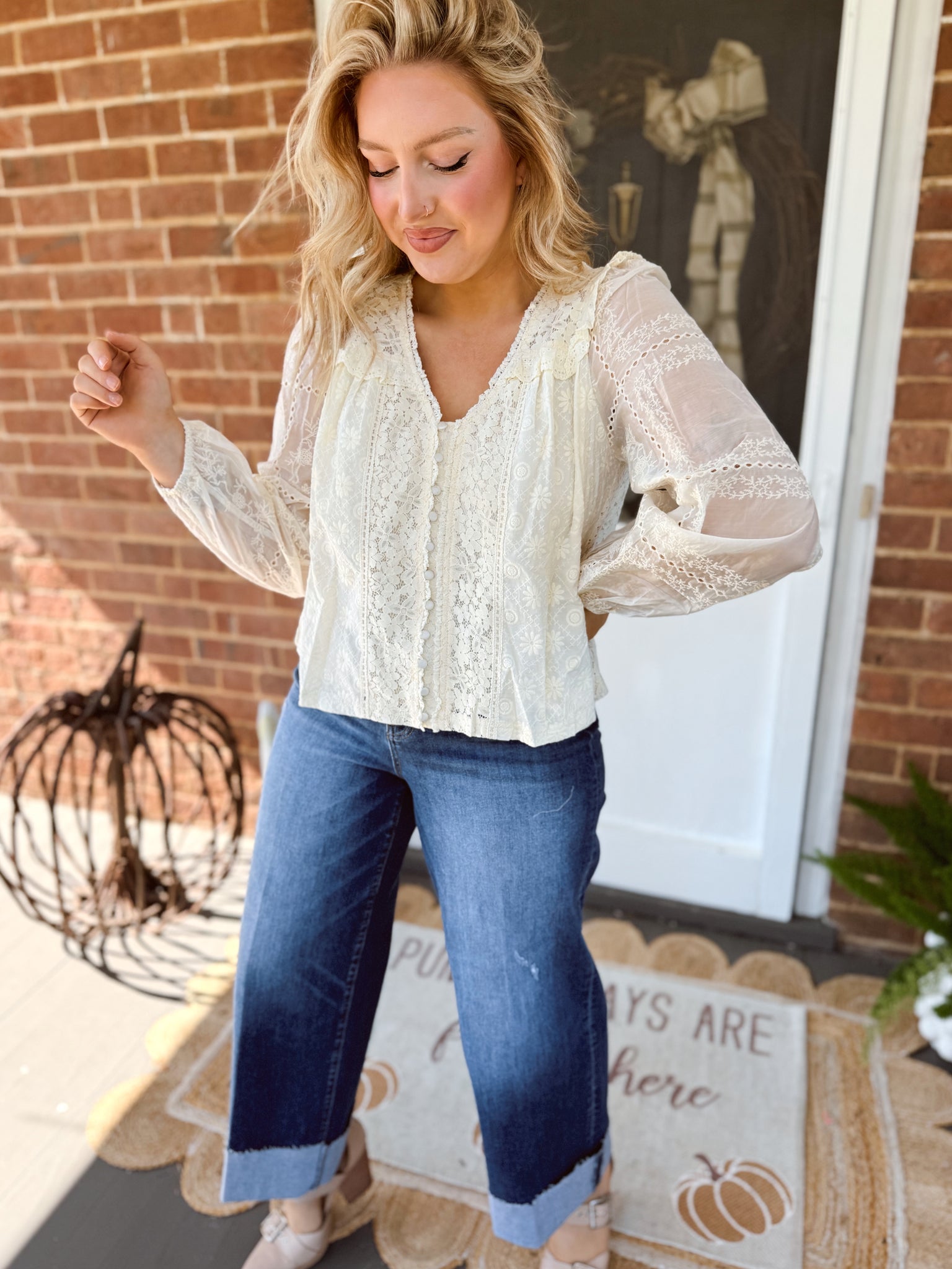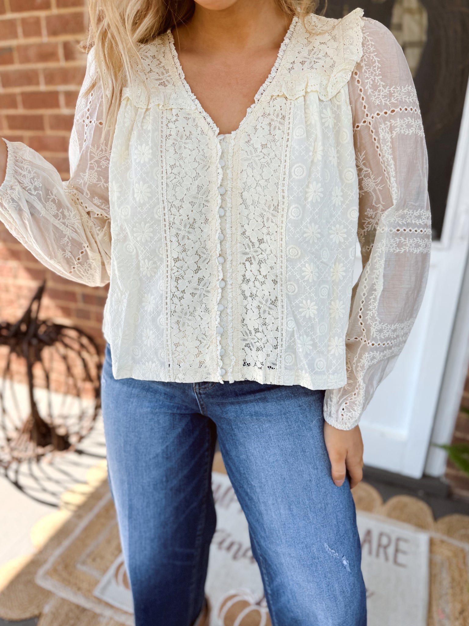 Romantic lace v-neckline ruffled long sleeve blouse with a crochet floral detailing along the button front.